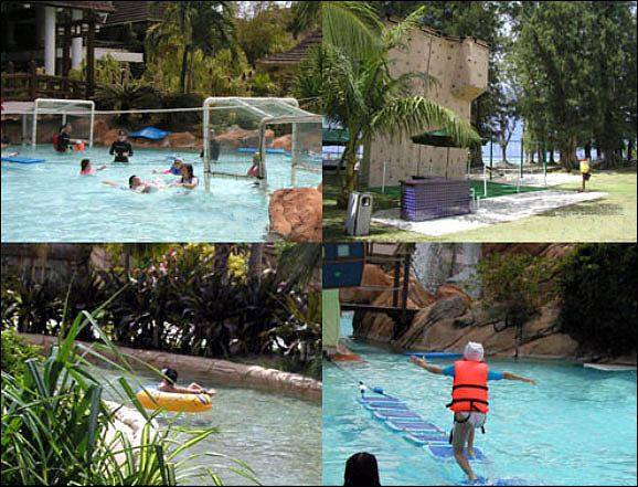 좌로부터 시계 방향으로 : 수중 배구, 암벽등반, 징검다리, 레이지풀